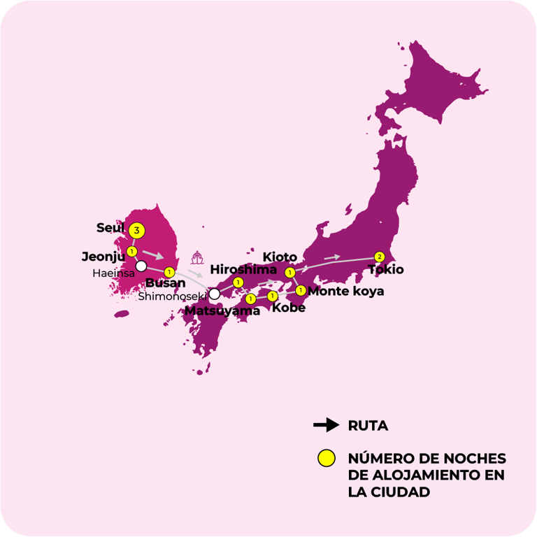 SEÚL, JEONJU, BUSAN, SHIMONOSEKI, HIROSHIMA, MATSUYAMA, KOBE, MONTE KOYA, KIOTO, TOKIO