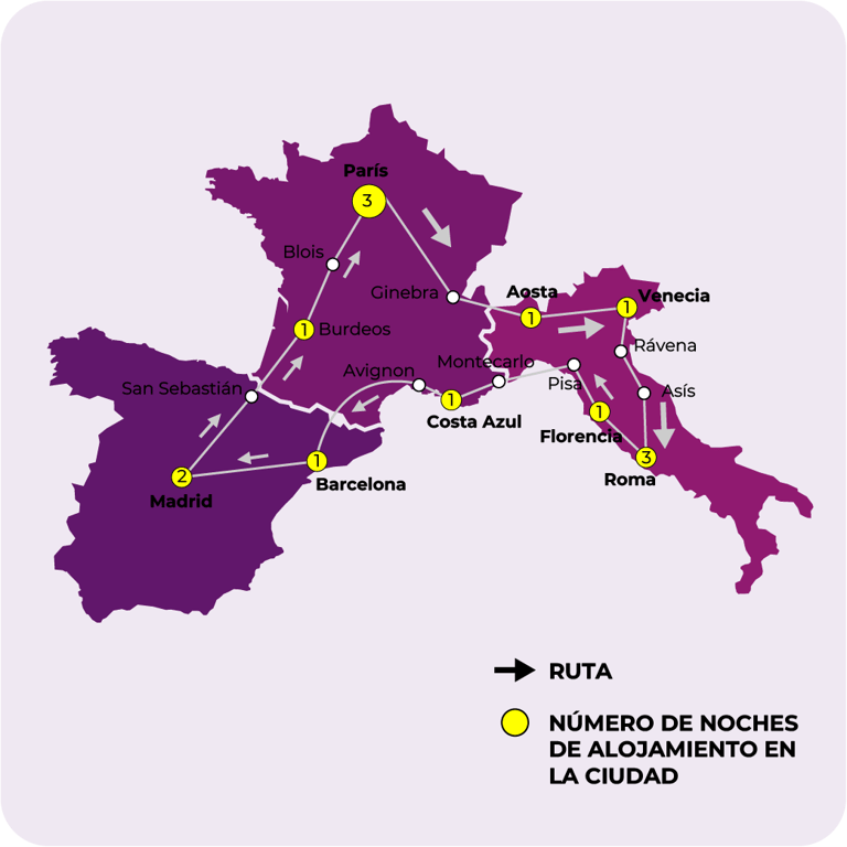 MADRID, SAN SEBASTIÁN, BURDEOS, BLOIS, PARÍS, GINEBRA, AOSTA, VENECIA, RAVENA, ASÍS, ROMA, FLORENCIA, PISA, SESTRI LEVANTE, MONTECARLO, COSTA AZUL, ARLES, BARCELONA