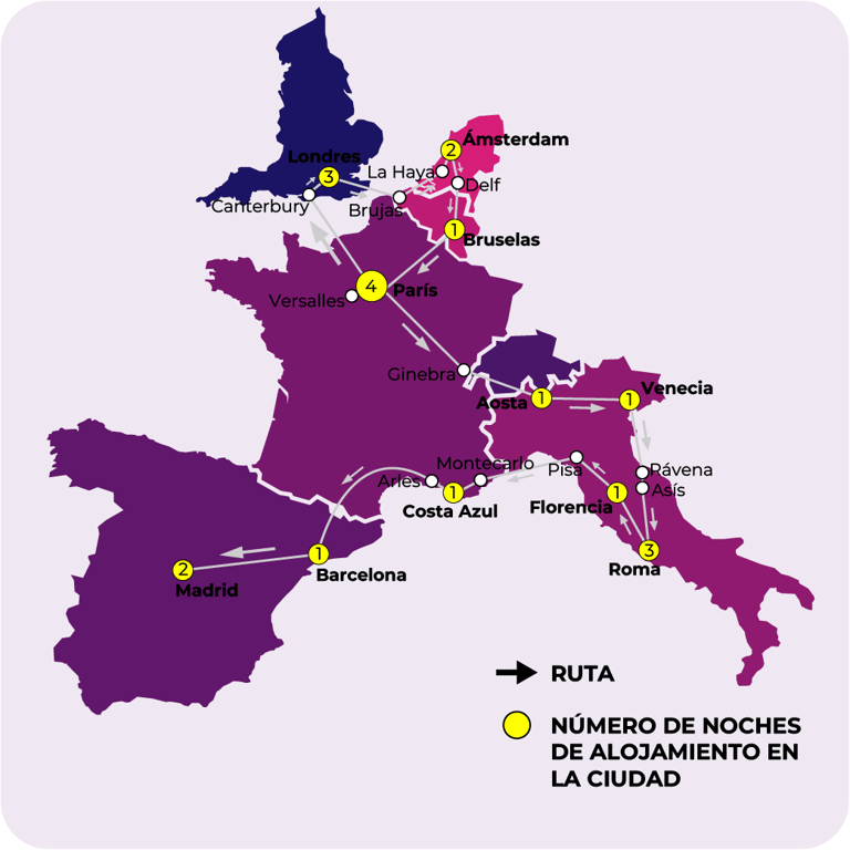 PARÍS, CANTERBURY, LONDRES, CALAIS, BRUJAS, GANTE, LA HAYA, ÁMSTERDAM, DELF, BRUSELAS, PARÍS, GINEBRA, AOSTA, VENECIA, RAVENA, ASÍS, ROMA, FLORENCIA, PISA, SESTRI LEVANTE, MONTECARLO, COSTA AZUL, ARLES, BARCELONA, MADRID