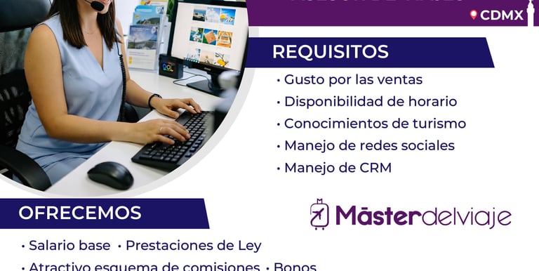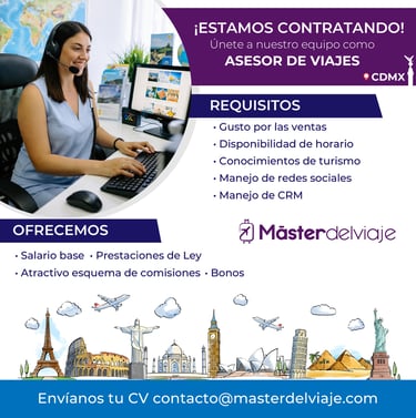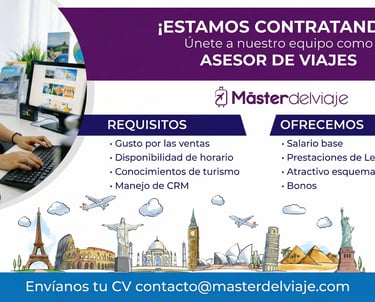 Agradecemos tu interés en formar parte del equipo de Máster del Viaje. Haz clic en el botón de abajo y envíanos tu CV con el asunto "Vacante Asesor de Viajes".